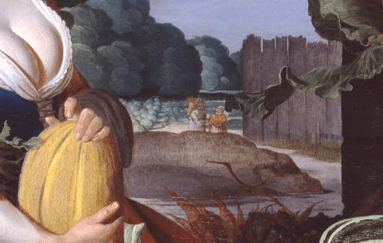 In the background we can just pick out the kitchen garden, growing an entire army of enormous cabbages. There is also a couple in conversation – it could even be towards them that the stray leaf is pointing. Bacon painted them after the background, and they have worn a little thin, so it’s hard to see what is going on. I really can’t work out what the woman is holding, but the man has a basket on his back containing the most enormous carrots. I suspect he has approached her because he wants to give her one.