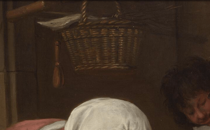 What’s going to happen to the mother next? Or to put that question another way, what can you see hanging over her? I love it when paintings can be so directly translated into words. Well, in this case, she has a basket hanging over her head. In it you can see some sticks and a crutch, as well as a rattle dangling down the left-hand side. Dutch society said that, if a wife proved to be a disappointment, she could be sent back home without her dowry. She could end up homeless. She would be beaten for her wrong-doing (the sticks), and might get ill (the crutch). And if she got really ill, she would have to warn people by shaking the rattle: ‘Unclean! Unclean!’