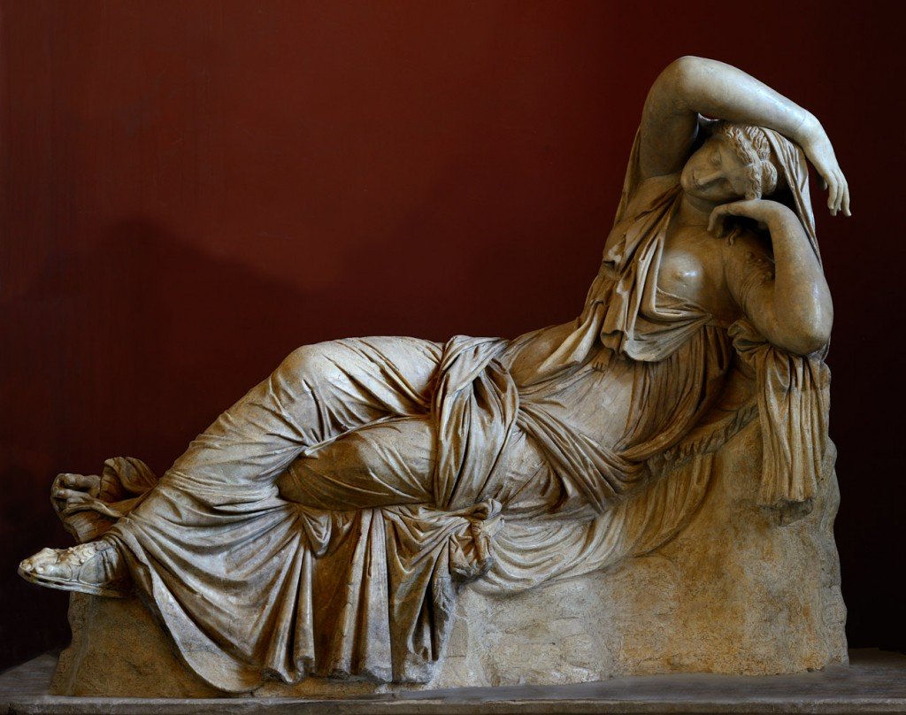 These two relief sculptures were invented by El Greco to add meaning to the story, but he makes reference to another sculpture, a real one, hidden away as one of the actors in the drama. Behind the man wrapped around with yellow fabric just to our left of Jesus, a figure has fallen to the ground, possibly female, with a blue skirt and white blouse. She is inappropriately dressed for the temple, and seems to lounge on her basket, her left hand wrapped around her head, as if she is shielding herself from Jesus. This pose is taken from a Classical sculpture of Ariadne in the Vatican museums: you can see it in the fourth picture. Not many people get to see it nowadays, as it is in a room just off the flow of the tourist tide, and roped off. I was once lucky enough to catch a glimpse when I was taking a group on what was called a ‘semi-private tour’, being led into rooms by the security guard accompanying us and not knowing exactly what would be in them. It was a pleasant surprise, as it used to be one of the most famous sculptures in Rome, near the top of the list of Things You Must See for the aristocratic 18th Century Grand Tourists and their middle class successors in the 19th Century. Dorothea sees it in George Eliot’s ‘Middlemarch’, although she was clearly unimpressed. When two observers find her, ‘She was not looking at the sculpture, probably not thinking of it: her large eyes were fixed dreamily on a streak of sunlight which fell across the floor’. Eliot’s point was presumably that Dorothea was not interested in art, and in the way that women have been objectified, but, as a more ‘natural’ creature herself, not to mention a modest Protestant, was more interested in the realities of the natural world.