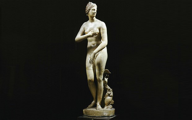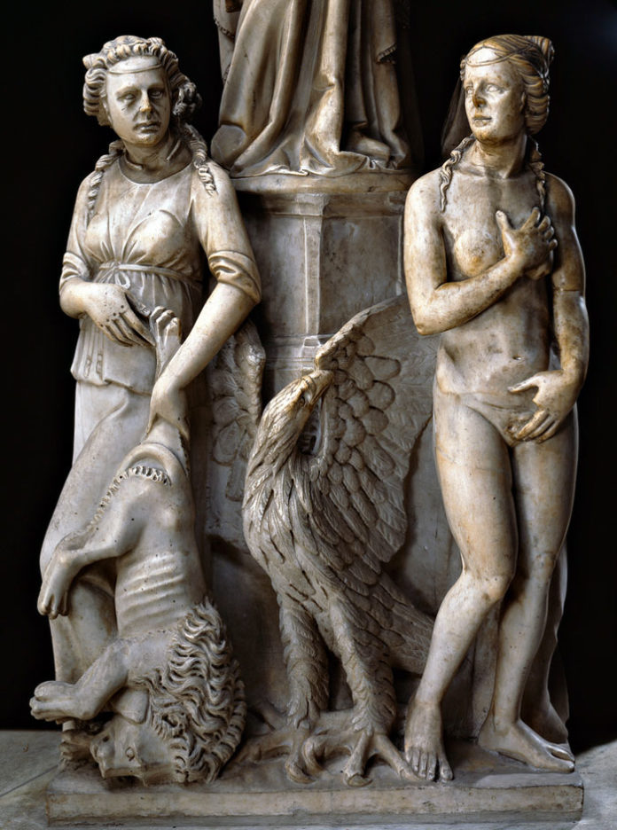 Another source – for both Poliziano and Botticelli as it happens – was almost certainly a classical sculpture known as the ‘Venus Pudica’ – the bashful, or modest, Venus. The one I’m showing you is called the ‘Medici Venus’, because it was in their collection, although it is not know when it was discovered. Either this, or an equivalent sculpture, must have been around quite early, because Giovanni Pisano used it somewhere between 1302 and 1310 for his figure of Prudence on the pulpit he carved in Pisa cathedral. You can see her in the photograph here alongside ‘Fortitude’, who is shown in full ‘trophy hunter’ mode.