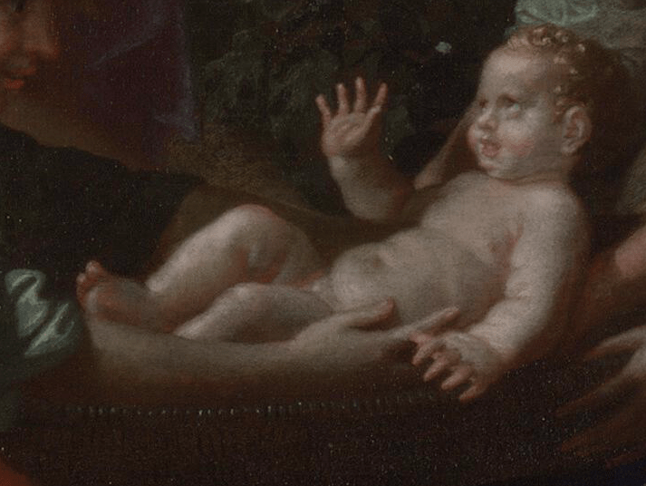 It doesn’t say how many maidens there were, but Poussin includes nine – although one of them could conceivably be Miriam. The general assumption is that she is the maiden in white holding the basket. The maid sent to fetch the child is still clambering out of the Nile, looking in our direction as if she wants us to share in her adventure. Her legs mark the diagonal leading from the bottom right, which then passes through the heads of the two women kneeling with the basket and that of the Princess, until it reaches the tree at the top left – just another example of Poussin’s measured composition. The maidens themselves wear brightly coloured clothes which echo each other across the painting and surround the baby with an almost rainbow-like aura. Moses alone is naked – although pointedly placed above royal blue fabric – and stands out because of the pallor of his skin.