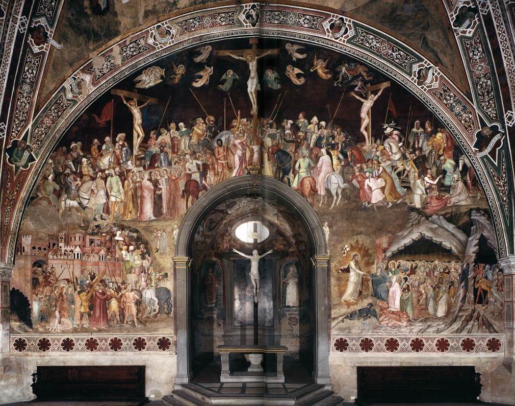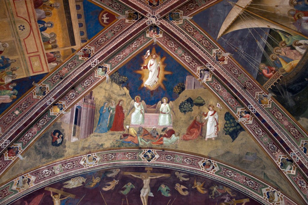 ‘The Harrowing of Hell’ is just part of the larger picture. It occurs at the bottom right of the Altar wall in the Chapter House (or Spanish Chapel). At the top we see the Crucifixion, and at bottom left the ‘via Crucis’. Christ, stripped of his blue cloak, is in his red robe, carrying the cross out of the city gate and up the hill to Golgotha. Bonaiuti is using the surface to perfection. With Jerusalem bottom left, he heads up the hill to Golgotha to be Crucified at the very top of the image, and then descends to hell at the bottom right: the gate of Jerusalem and the gates of Hell are equivalent. Although, if we look forward to the New Jerusalem, you realise that the earthly city is shown under Jesus’ right hand, on the side of the Good Thief, whereas hell is on his left, under the Bad. No wonder the devils are scared of Jerusalem. With this wall, we get to the end of a chapter – or the end of an episode – and fortunately, we have the box set. What could possibly happen next? Well, spoiler alert! He rises from the dead! But where can Bonaiuti go from here? He’s filled up the entire wall! In the immortal words of that little-known 80s gospel singer, Yazz, ‘The Only Way is Up’. You’d have to look up at the ceiling.