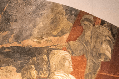 But how, you might be asking, does Alberti come into this? He wrote his commentary on painting – rather conveniently called ‘On Painting’ – in 1435, in Latin. One of his intentions was to raise the status of his subject among his learned (or at least, rich) patrons, as they were far more likely to be able to read Latin than artists were. However, realising that, to have a direct influence on painting itself, it would be useful if the artists could read the book, he translated it into Italian the following year. It was the first text to describe how to ‘do’ perspective, the technique having been devised by Brunelleschi some 20 years before, and then put into practice by Masaccio and Donatello among others. Nevertheless, the perspective of the pergola is almost certainly indebted to Alberti. But the influence becomes more obvious if you look at the image at the top of the wall.
