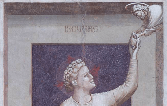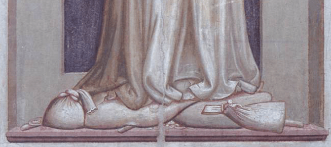 Charity tramples moneybags underfoot – worldly wealth is not important to her. In this context the rejection of moneybags should, of course, be seen in reference to Reginaldo degli Scrovegni, father of the patron of the Chapel, Enrico, who Dante had seen in the Seventh Circle of Hell among the usurers, with a money bag tied around his neck.