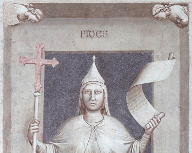 At her feet lie a broken sculpture, and two rectangular slabs. The sculpture represents a pagan idol, the sort of classical sculpture which had already been an inspiration for Nicola Pisano (POTD 8) and would be even more important for the artists of the Renaissance a century later. Although, yet again, is Giotto saying that we don’t need sculptures, given that he can paint them better than other artists could carve them? The two slabs are probably meant to be the tablets of the Law brought down from Mount Sinai by Moses – the Ten Commandments. The implication is that, with Christianity, the old orders have passed away. Paganism has gone for good, and the Law of Moses has been superseded by the Grace of Christ. That is what Faith means.