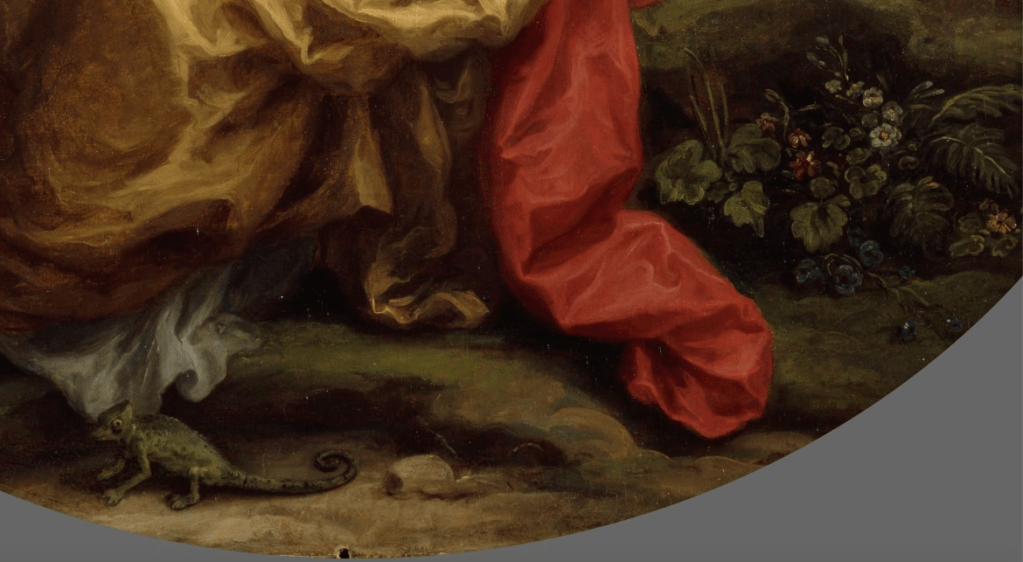 The rainbow is not the only symbol she uses to express the idea of colour. The figure herself is wearing red, yellow and a small amount of a very subdued blue – the three primaries – just as ‘Painting’ does, if more intensely, in her self portrait (POTD 14). There is also a small group of flowers growing at the bottom right – generic flowers, the Ecologist tells me, not specific ones – chosen, presumably, because flowers grow in all the colours of the rainbow. There is also a creature I have not seen elsewhere in art, even though Vasari does mention it in a lost painting by Uccello. The chameleon is famed for changing its colour according to its environment. Artists too are chameleons, Kauffman says, or rather, their paintings are, as the paintings taken on the exact colours of their subjects. I love the fact that she has painted a chameleon. As I say, you don’t see them very often in paintings – and it does look rather surprised to be there!