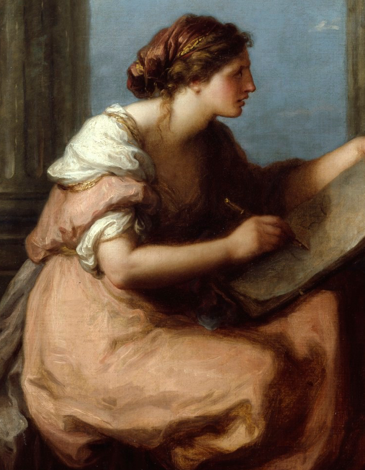 Rather than using the rainbow as a symbol of hope, as we have seen previously (POTD 37 & 47) here is used as a source of colour. The personification is shown with her paintbrush resting on the rainbow, which then begs the question: is she painting the rainbow, or extracting colour from it? I think you are free to read it either way. Clearly, it makes no sense practically, as a rainbow does not exist, it is an effect of light, but metaphorically an artist is free to draw on all the colours of the rainbow. This metaphor might be the more logical interpretation, therefore, as the palette which she holds in her left hand has just one small smear of yellowish paint – she certainly doesn’t have all the materials necessary to paint a rainbow. In Italian, both colore and colorito mean ‘colour’. The latter can also mean ‘complexion’, while the former is used for ‘paint’. The word vernice does exist for ‘paint’ or ‘varnish’, but when describing paintings only ‘colore’ is used. Both words are masculine, and yet Kauffman paints Colour as female. OK, she wasn’t Italian – but then she wasn’t English, either. In German, the word is ‘Farbe’, which is feminine. More importantly, of course, so was Angelica Kauffman. Indeed, all four of her personifications in this series are female. This is a statement of intent, as much as anything. It has often been suggested that all four are disguised self portraits – or, at least, that she is using herself as a model. This is very unlikely. For one thing, all four have different hair colouring (easy to achieve, of course), but, for another, they are different ages. Not only that, but, as a woman in the public eye, she had to be wary of her reputation. She would not show herself in the advanced state of deshabille that Colour enjoys.