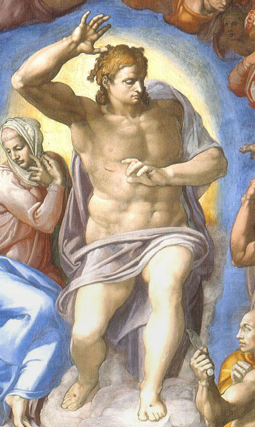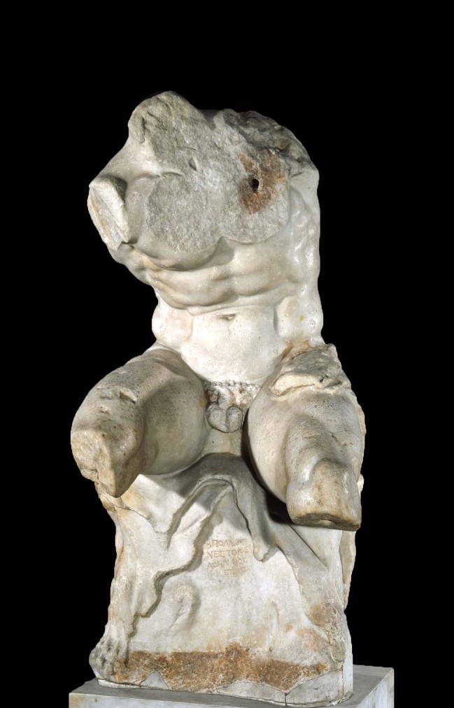 Nevertheless, I can’t help thinking that Design is just a little bit cleverer. Of any of the four paintings, this is the one that looks most like Kauffman’s acknowledged self portraits (compare it with POTD 14, for example), and I feel sure she would have been happy to show herself studiously at work. Since Alberti wrote On Painting in 1435, it had been standard artistic practice to start your training by drawing from sculptures. His reasons were quite clear: ‘It would please me more to have you copy a mediocre sculpture than an excellent painting… from sculpture you learn to imitate it and how to recognize and draw the lights’. Not only that, but Angelica has chosen to draw the sculpture of choice for any budding draftsman, the so-called Torso Belvedere. Known in renaissance Italy from the 1430s, it was long believed to be an original Greek sculpture dating to the 1st Century BC. It is signed, “Apollonios, son of Nestor, Athenian”, and gets its name from its present location, the Palazzo Belvedere in the Vatican. However, it is now thought to be a copy from the 1st Century BC or AD of an earlier work – possibly 2nd Century BC. Regardless of its origins, it is classical, muscular, and incomplete, it leaves much to the imagination and spawned numerous drawings and nearly as many suggestions for how it should be reconstructed. You could argue that most of Michelangelo’s later career was spent suggesting reconstructions – the figure of Christ from the Last Judgement being just one example.