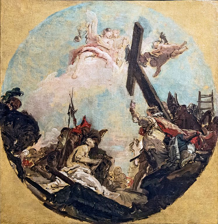 The bozzetto is a sketch for a circular ceiling painting originally made for the Church of the Capuchins, which is not so terribly far from Venezia Santa Lucia (the railway station) or, in Tiepolo’s day, the Church of St Lucy (which was destroyed to build the station). I don’t think I’ve ever been in – but then, that’s probably because the Tiepolos aren’t there: the finished painting has ended up in the Accademia, in the same room as the bozzetto. It shows The Discovery of the True Cross, the high point of a story which is rather wonderful, but far too long to tell here (well, it does start with the death of Adam…) There are two main fresco cycles illustrating the story, one in Santa Croce in Florence (which makes sense, as the Church is dedicated to the True Cross), and the other is in San Francesco in Arezzo – we saw the Annunciation by Piero della Francesca from this cycle back on the Feast of the Annunciation (25 March, POTD 7). It is not a coincidence that both are Franciscan Churches – St Francis himself had a particular devotion to the Cross (POTD 29), and as the Capuchins are a reformed Franciscan order, it’s not surprising that they were interested in the same subject.