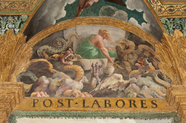 Once again, Giulio Romano is in what we might today see as comic-book mode, with cartoon dragons on either side sporting long curving necks, tails and tongues. Psyche, who rather unhelpfully, given what I just said, has had time to stop and change into a green dress, is still stooping, trying to reach the water. The eagle is already there, all dignity, calm, and sobering solemnity, just about to take the container from her. Once he has returned it, Psyche heads back to Venus’s palace, her task fulfilled.