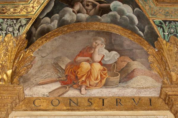 This is one of the episodes which Giulio Romano included in the lunettes (semi-circular paintings) at the tops of the walls of the Sala di Psyche. As a reminder – and so you can see where the lunettes are – this is what the Sala di Psiche looks like (although the ants are on one of the walls behind us):