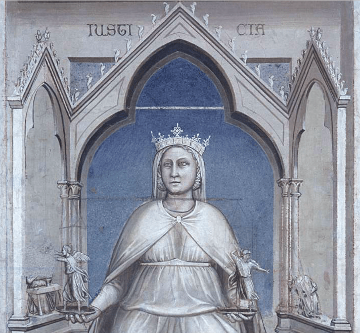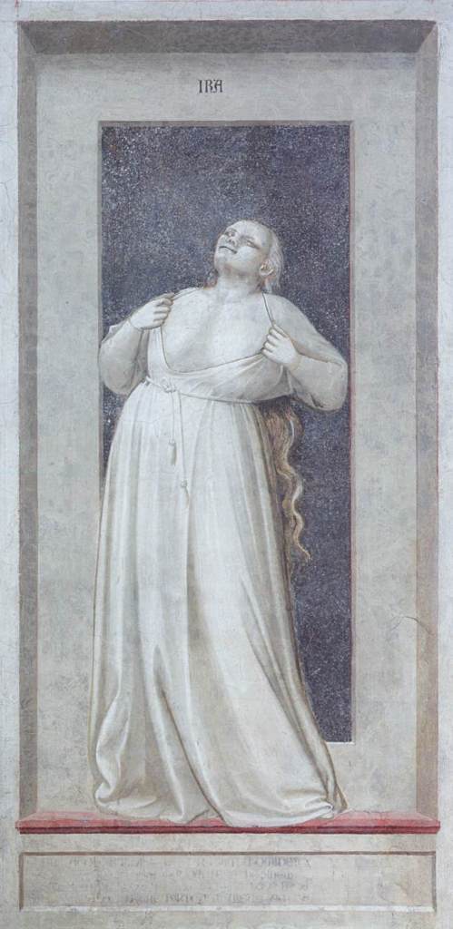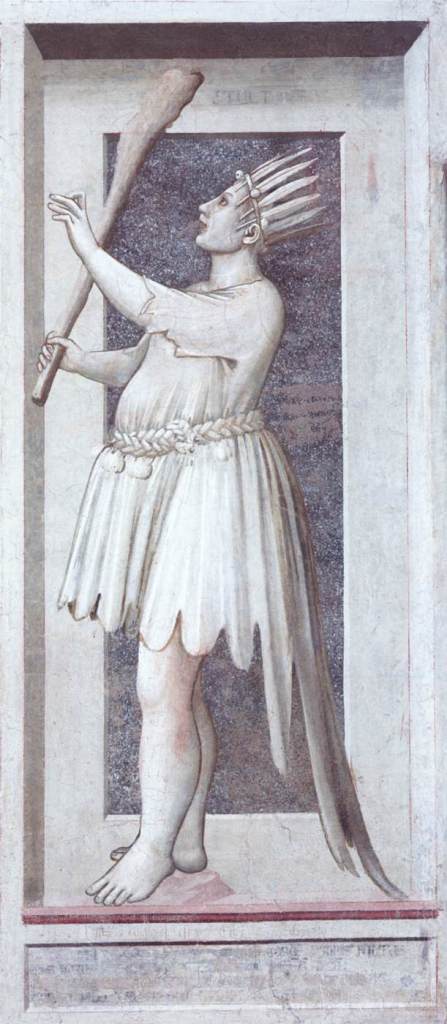 Opposing these four we see Injustice (he’s below), Anger, Inconstancy and Foolishness. Looking at this wall, the Last Judgement – and the entrance – are towards our left, and that is the direction that most characters look. From the right, this time, so moving away from the altar, Foolishness looks foolish, its that simple. Waving a stick, with a crown of feathers, and ragged clothes, this could be a medieval Fool, perhaps, but not a witty one, not with the insight we see in Shakespeare. Inconstancy – lacking the solidity, the firmness, the dependability of Fortitude, rides a wheel along a sloping marbled floor, out of control and, thus, completely unreliable. Anger – or Wrath – the only Vice who is also a Deadly Sin – rents her clothes, and lets her hair run free. They are a pretty unattractive bunch, which is probably just as well: we wouldn’t want to be like them. Let’s compare Injustice with his opposite.