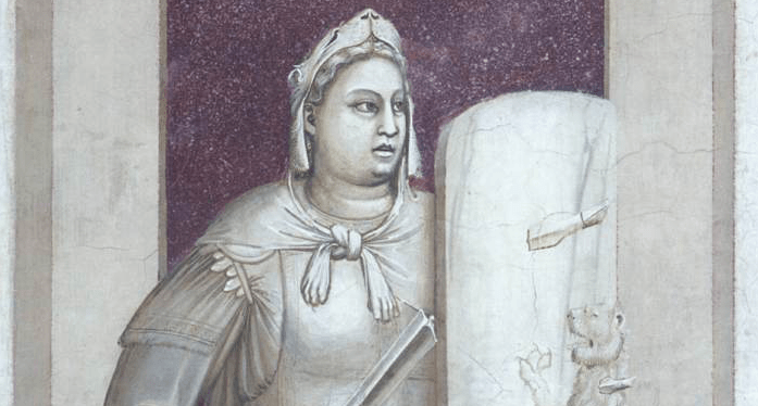 Justice is unlike the other virtues – indeed, of the Cardinal Four, she is the chief, ruling the interaction of the classes, as far as Plato was concerned. She sits enthroned, and balances the entire wall, sitting as she does at the centre of the Chapel. The three trefoil sides of her gothic throne, and its sky blue background, make me think of Mary, Queen of Heaven – and Justice here is crowned. This was certainly an elision seen in Venice, which is not so far away. She holds the pans of her scales in either hand – but not the beam or connecting cords. And that’s because she, herself, is the balance. However, this concept was original enough, and unusual enough, for someone to find it uncomfortable, to the extent that they tried to sketch in the rest of the expected scales. In her right hand an angel leans forward to reward the good (sadly lost in a damage to the fresco), and in her left, a second prepares to strike a kneeling malefactor, distributive and retributive justice respectively.