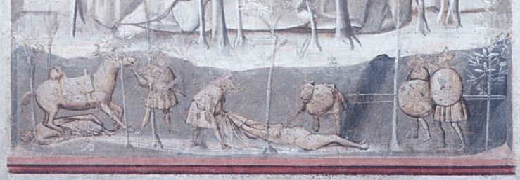 Hers, above, shows a courtly couple out hunting with their dogs, safe in the ordered countryside; a group of ladies dancing; and well-provisioned travellers arriving from the right. His, below, shows a pair of soldiers opposite the courtly couple; the dancers face a rape; and a traveller has been murdered. If any of you know Ambrogio Lorenzetti’s Allegory of Good and Bad Judgement in Siena, these tiny paintings say what Lorenzetti says, some 33 years later, across one and a half walls.