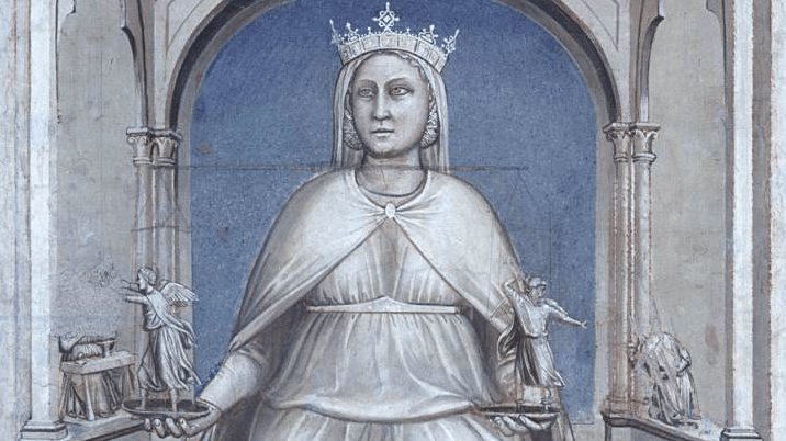 I wouldn’t want to pick a fight with Fortitude. Plato associated her with man’s spirited nature, and with the warrior class. Giotto makes her a doughty dowager, armed for war: I’d keep out of the way of that stick. She holds a full-height shield which has spear heads embedded in it, and you can also see the bolts of the handle she is holding on the other side. It is decorated with a lion, which, in other manifestations, would be one of her main symbols, and she puts the ‘her’ into Hercules: she is wearing the pelt of the Nemean Lion, slain by the ancient hero as one of his labours. Its muzzle is over her head, while the legs are tied around her neck and waist. I’d feel safer, though, with Temperance, Fortitude’s pacifist sister. Associated with moderation or self-restraint, she has sheathed her sword, and is altogether self-contained. In other images she waters down the wine – not a virtue I’ve ever been guilty of, I’m afraid. Plato thought that, in his ideal Republic, this quality should be possessed by the farmers and craftsmen – the producing classes – and I can’t help thinking that it smacks of an economy that the rulers need not have worried about…