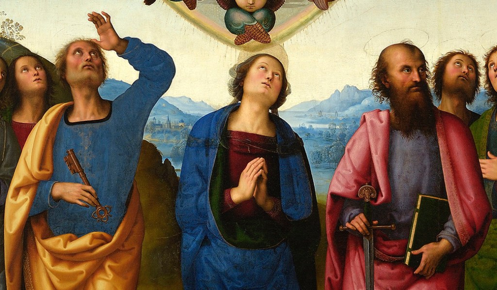 The central figure is, of course, the Virgin Mary. There is nothing in the Bible to say that she was there – but then, there is no reason to suppose that she wouldn’t be, and it became a standard part of the iconography of the Ascension (i.e. the way that it is depicted) to include her. And, being Mary, she must be in the middle. She looks up towards her son, although she is awkwardly placed to do so, as her halo appears to be in front of the mandorla (the almond-shaped glory – see POTD 42) within which Christ stands. The Apostles have given her space, making her more prominent, and her head stands out clearly against the pale sky behind her. Perugino has painted a typical Umbrian bowl landscape (an idea he would pass on to Raphael – see POTD 23), with the horizon level to the right and left, and curving down in the centre, just like a bowl: it frames Mary’s head perfectly. The detail of this landscape is enchanting. Delicately picked out to the left of the Virgin’s right shoulder is a small town with turrets, towers and a domed church, and there is another chapel on a distant hill. Standing next to Mary, to our left, we see a man in yellow and blue, with short grey hair and beard, holding a key – this is St Peter, in his typical colours, and he is holding the key to the kingdom of Heaven. To our right of Mary, with a long dark beard and receding hairline, wearing a red cloak and holding a sword, is St Paul. That is, figuratively, a two-edged sword – it represents both his persecution of the Christians as Saul, and also, his own martyrdom by beheading. The only problem with St Paul being there is that the Ascension happened in Acts chapter 1, whereas Saul was not converted until chapter 9 – so he shouldn’t be there yet. The painting is clearly a ‘statement’, rather than a narrative, and shows us the status he would later have as one of the two leaders of the Church after Christ.