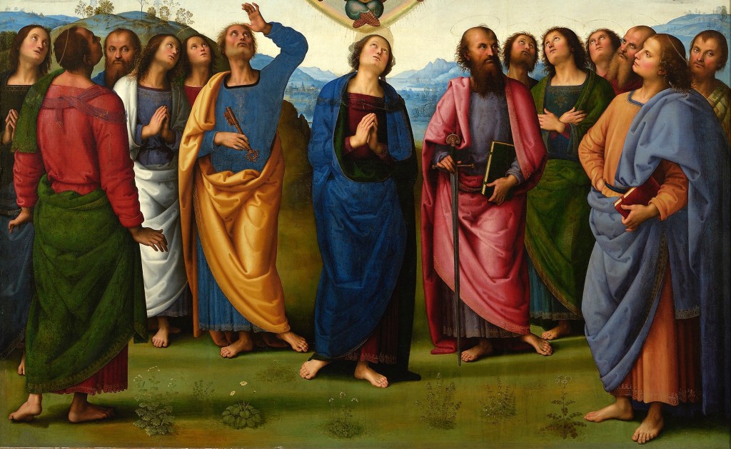 When Pietro Perugino came to paint this event for the Benedictine monks of San Pietro, just outside the walls of Perugia, he chose to show Jesus doing just as Luke says, still in the act of lifting up his hands and blessing them. But he also chose to paint fourteen people standing on the ground, which intrigues me. Luke does not say how many people were there, although the Ascension follows on, with a few intervening episodes, from the Supper at Emmaus (Picture Of The Day 30), after which the two pilgrims went and found ‘the eleven gathered together, and them that were with them’. That was, theoretically, forty days before the Ascension, according to the Acts of the Apostles, which likewise does not specify who was there, but the ‘eleven’ mentioned by Luke were the remaining apostles, given that Judas had committed suicide. So how come there are fourteen here? Are the other three ‘them that were with them’?
