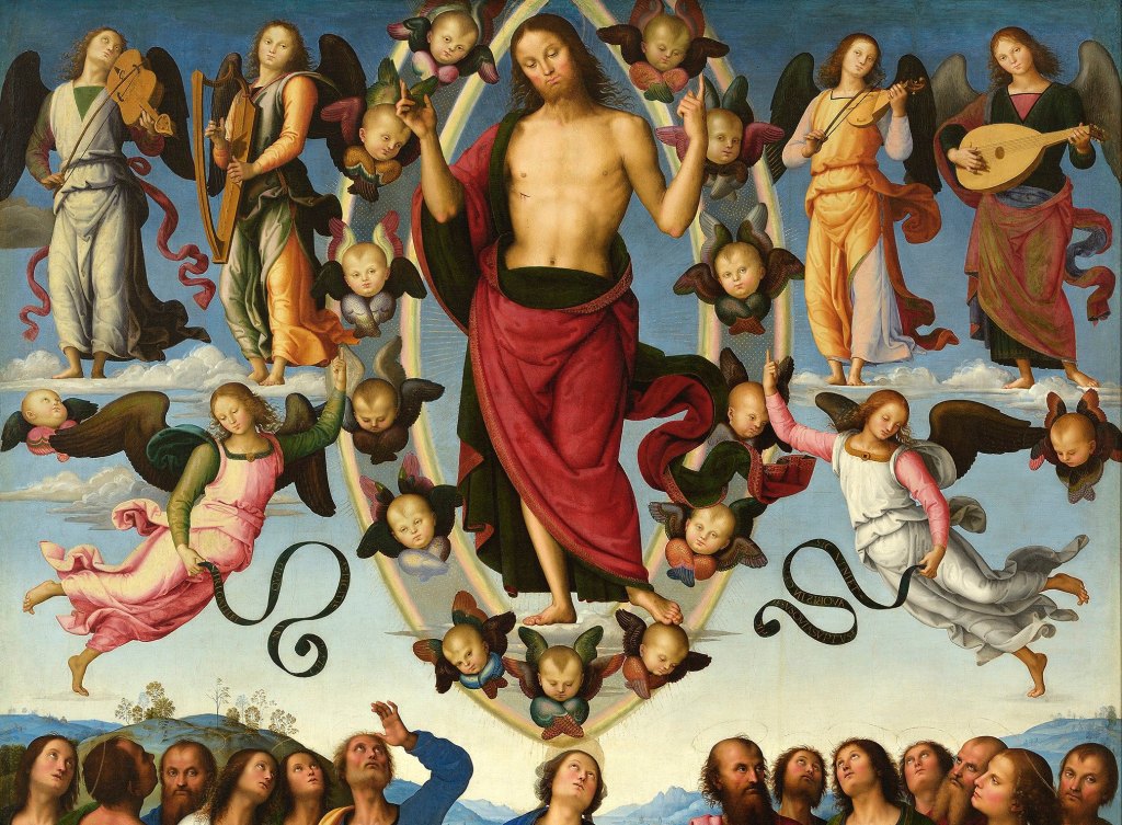 Four angels at the top of the painting stand on slightly more substantial clouds, playing music to accompany Christ’s departure. He stands within the mandorla, his right foot planted firmly on a cloud, and his left resting delicately, if slightly comically, on the head of a cherub, his big toe curving comfortably round its scalp. He wears the most striking red robe – this is hardly the shroud-cum-toga we have seen before (e.g. POTD 24 & 25), although it does remind me of the surprising red loincloth in Raphael’s Mond Crucifixion (POTD 23). Maybe it was an Umbrian thing, but it certainly refers to the Byzantine use of the Imperial purple – Jesus is King, after all.