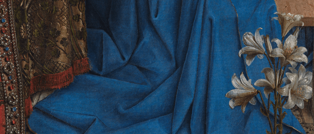 The picture is very tall and thin – which isn’t ideal for the formatting of this blog, I know – but implies that it might have been part of a larger ensemble. However, van Eyck created a number of small, devotional panels that fitted the taste of the times, which, especially in Northern Europe, was for private devotion at home. We see the Annunciation taking place in a church, and van Eyck was the first panel painter to do this. It relates to the idea that, as Mother of Jesus, Mary was effectively ‘home’ to him for the first nine months of his earthly existence (POTD 71). As the Church is also the House of God, there is an equivalence between Mary and the Church – she becomes elided with Ecclesia, the personification of the Church. That is why, in several paintings, although not so obviously this one, she is clearly out of proportion with her surroundings. Even here, were she to stand up, she would be roughly as tall as the arcade behind the angel. She has, as so often, been contemplating the scriptures, and Gabriel appears bearing his staff of office (POTD 70). No need to bring a lily for the expectant mother, as there is a vase full of them just in front of her lectern.