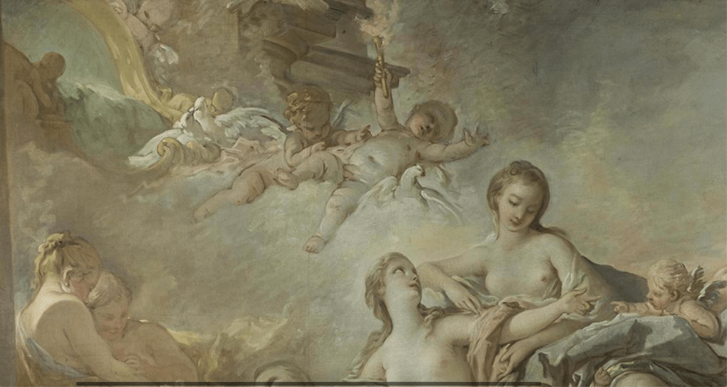 One of the great joys of doing POTD, to be honest, is finding myself looking at paintings I’ve never seen and can’t find any information about – so we’re left with the looking, which is what this is all about. I know this was painted in 1767, so is a late work – Boucher was 64 and died three years later – but apart from that, I don’t know who it was painted for or where it was supposed to hang… which would be useful as it might explain some of the painting’s peculiarities. Is it a straightforward illustration of Ovid’s tale? Well, let’s have a look.