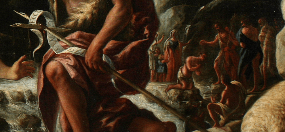 Pareja includes this too, in the bottom right-hand corner. One person kneels as he is baptised, while others, scantly clad, await their turn sitting on the rock just below, or standing to the right. There are also some women, lining up with children, next to a waterfall coming down the adjacent hill. In this detail you can see the reed cross that the Baptist often carries – it is often made out of bamboo – and here there is a scroll wrapped round it saying ‘Ecce Agnus Dei’ – ‘Behold the Lamb of God’. This is actually a quotation from the Gospel of St John 1:29: