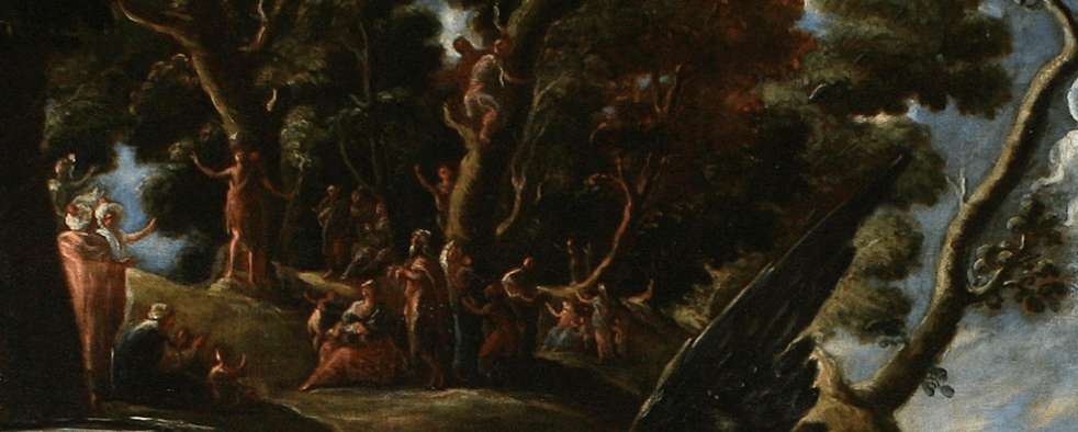 The angels complete a diagonal of sanctity, which starts with God the Father, passes through the Holy Spirit and Jesus, and broadens out to the right-hand angel. Along the other diagonal we have John the Baptist – he is preaching in the top left, baptising Jesus in the centre, and dealing with the multitudes at the bottom right. It is a masterful construction, remarkable for its ability to include a wealth of both narrative detail and theological significance. It also seems a remarkable leap from the relatively straightforward depiction of the Flight into Egypt we saw last week. It’s not entirely clear when it was painted: you can see Pareja’s signature on the rock at the bottom left of the detail with the angels, and a date which could read 1667, and yet the Prado is unspecific, saying just ’17th Century’. I’ve also seen 1661 suggested, which could be another reading of this inscription. As Pareja died in 1670 it must certainly have been before then – which is why I have suggested ‘1660s’. He was certainly an artist who knew what he was doing – if only there were more paintings by him – or that he had had more time to practice his craft freely.
