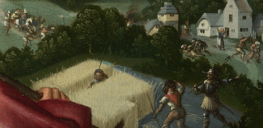 Soldiers emerge from one of the gates of the city – Jerusalem – heading towards a small village – Bethlehem. One group is crossing the bridge which leads out of the city, while another has already made some headway. The latter group, closest to Joseph’s nose (on the picture surface, at least), has a leader on a white horse, others hold spears, and a few have flaming torches. At the point where the buildings emerge from behind the trees, flames are visible: they have set fire to the village.  On the green a woman stands with her arms in the air, a soldier attacks another woman to the left, while on the right a third woman runs away from another soldier. This is the massacre of the Innocents: Herod’s soldiers have come to find Jesus and to kill him, and so as not to be outwitted, they kill all the children under the age of 2 (Matthew 2:16). Pareja included this story in the background of his painting, although it was far too small to be seen with any clarity, whereas Giotto dedicated an entire painting to it.
