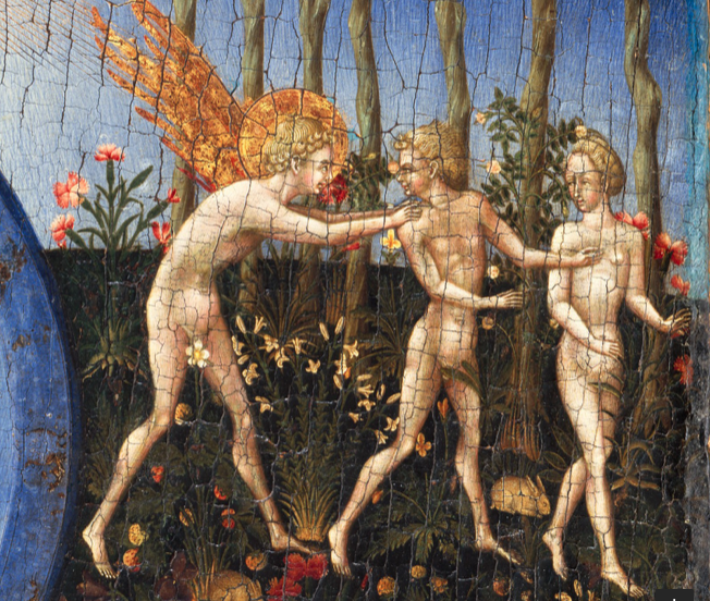 Over two days I will look at two small paintings which were part of a larger whole. Today, we have a panel which shows The Creation of the World and the Expulsion from Paradise. On the left we have the entire cosmos, constructed like a multi-coloured onion in concentric layers, with God on the outside. His hand is pointing into the sky. It’s not uncommon to see this from our point of view, with the ‘Hand of God’ poking out of the blue – a good example would be Giotto’s Sacrifice of Joachim (POTD 66). In this case he is presumably creating something or other – possibly the plants, as I can definitely see some trees, but no birds or animals, which would make this Day 3 of creation. On the right of the painting we cut to ‘some time later’ – Adam and Eve have been created and tempted and are now being expelled from the Garden of Eden, pushed out by an angel past a row of trees bearing golden apples. Beneath them are four dark streaks – the four rivers of Eden, as mentioned in Genesis 2:10-14, where they are named as Pison, Gihon, Hiddekel and Euphrates. Although the third of these is usually interpreted as the Tigris, neither of the first two has been identified, although Gihon is recognised by some as the Abay River, or Blue Nile.