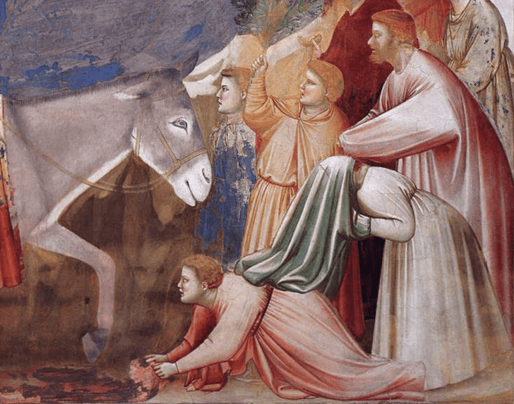 Christ is followed by his apostles – I can only see 10 haloes, but the other two, one of whom would arguably not have a halo, can be imagined as ‘offstage’ at the moment, and just about to enter. One of the features which Giotto includes, which we did not see in the Riemenschneider, is a second animal, small, and sketchy. I presume it was painted a secco, and may have been an afterthought. It could have been a member of the church who wanted to tie the different biblical accounts together. This creature is mentioned in Matthew 21:1-2: