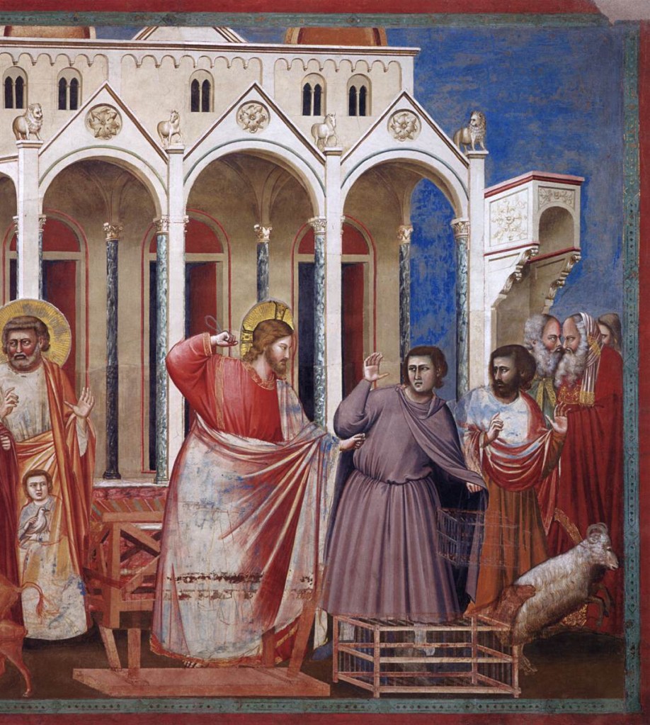 The Expulsion of the Money-changers from the Temple brings us to the end of another chapter in the Scrovegni story, which could be entitled Christ’s Mission – although, as ever, Giotto keeps the story going by taking us round the corner. And the sheep seem to lead the way…