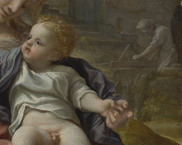 Beyond the fence we see the carpenter Joseph at work, using a plane to smooth a post, or something similar. Correggio’s control of atmospheric perspective (the way in which the air, or atmosphere, affects the way we see distant objects) is superb, and Joseph is painted almost in monochrome, as if the air were misty, or full of dust. He appears to be marginalised, a subsidiary part of the painting: this would have been Correggio’s intention. Poor Joseph, he is excluded from the verdant garden in which Mary and Jesus share such an intimate relationship. But then, when you remember that the word ‘paradise’ is derived from an Old Iranian word meaning ‘walled enclosure’ – or effectively, ‘garden’ – not only is the garden, but also the wall, explained. Jesus, as Son of God, is already – and is always – in paradise, even if temporarily with us on Earth. Mary, free of sin (see Picture Of The Day 71 and POTD 72 – The Immaculate Conception), would never have to suffer the penalty of expulsion. Joseph, on the other hand, as a descendant of Adam and Eve, is excluded from paradise until Christ’s sacrifice redeems him. Not only that, but, unlike Mary, he is not physically related to Jesus – he may be Christ’s stepfather, and an honourable man, but he has no exemption from damnation should Christ’s mission fail. Which, admittedly, we know it won’t.