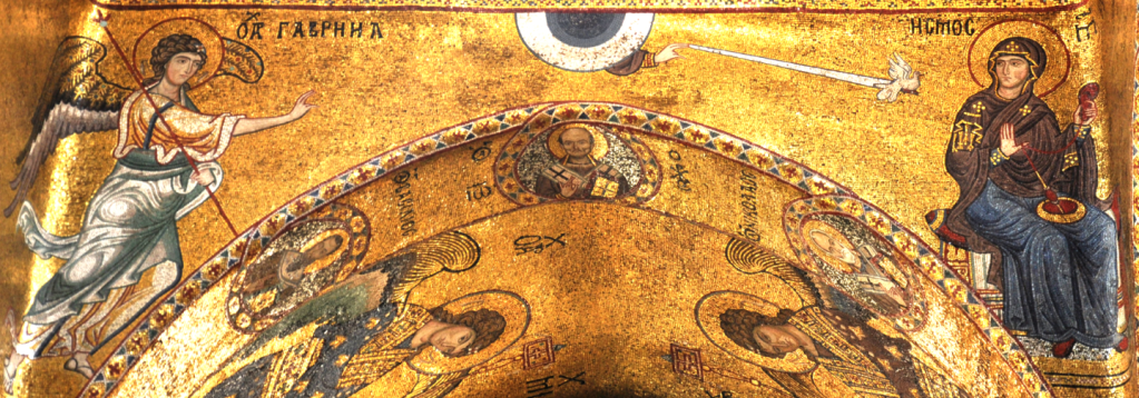 In this 12th Century mosaic Annunciation from ‘La Martorana’ in Palermo we see Mary, wearing the imperial purple, in the process of putting down the thread she has been spinning as Gabriel approaches. We might not see this as purple, but the meaning of the word itself was not fully defined for centuries, and could refer to almost anything between red and blue. This thread needs to be distinguishable from her own clothing, but also to look rich – and it works on both counts.