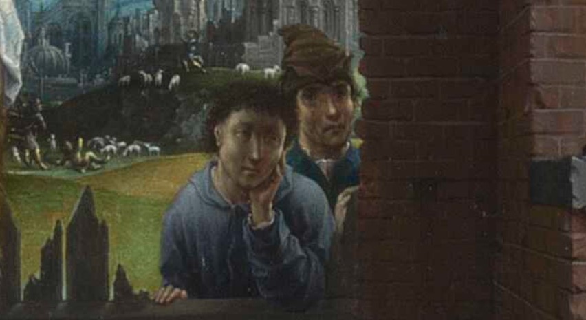 This is the first of two days of Shepherds. Today I’m not interested in the two in the foreground – well, the foreground of this detail, anyway, they are quite a way back in the painting. Leaning over the wooden fence, we can tell they are shepherds because they are poorly dressed, with dull, plain fabrics, no patterns, no accessories. But further back there are more shepherds, ‘keeping watch over their flock’.  They are the ones of interest today. The fence the foreground pair peer over, like the rest of the building, is in a poor state of repair, and only a few of the vertical slats have lasted above the horizontal plank to which they are attached. One, just in from the left, still has its original sharp point, which seems, probably intentionally, to be pointing to a shepherd, ‘seated on the ground’.