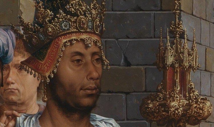 Again, we have the idea of kings, and again Sheba comes to the fore. To be honest, no one is entirely clear where it was, although current opinion is that it should be identified as Saba, in South Arabia. However, Josephus, writing in the 1st Century, thought it was in Ethiopia, and this is the opinion that would have been current when our magus was painted. This is more than enough justification for a Black King, although the earliest known example wasn’t painted until around 1360. It’s not something I know a huge amount about, so I’m looking forward to finding out more: my colleague Leslie Primo will be my guest for the first session of the National Gallery’s Stories of Art: Module 3, which starts on 6 January (the course goes on general sale on Friday), and will be talking about the Black King.