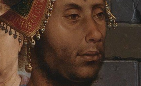 The story of the Magi – who, what and whence – is common to all paintings of the Adoration. The the Black Magus – or King – on the other hand is a relative newcomer, and not fixture. He appeared first in the second half of the 14th Century, and featured more and more regularly throughout the 15th and 16th Centuries. However, there is one way in which this image stands out: it is not a racial stereotype, unlike so many, but the result of meticulous observation.