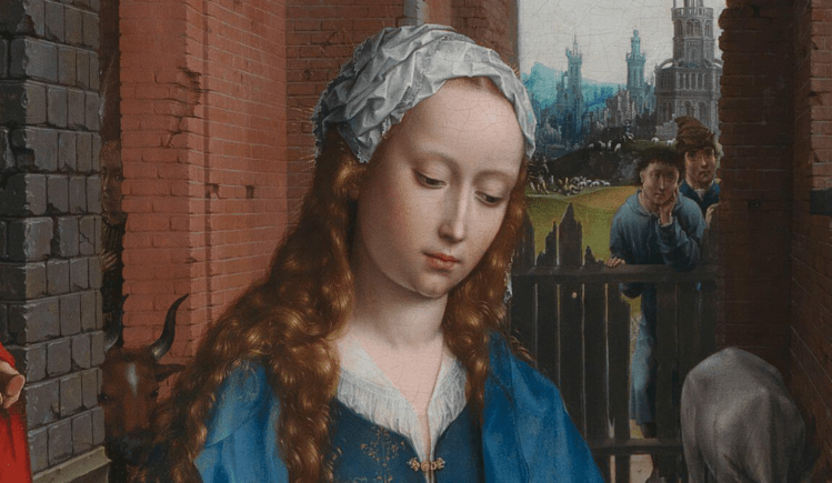 As this was painted in Northern Europe, the fact that she is blonde should not surprise us – Gossaert is painting for a local audience, and they want something that they can understand, something that is familiar. This is one of the features of the painting that helps it to communicate. Even in Italy, where the majority of the population are dark haired, Mary is blonde, more often than not – and there are numerous reasons for that. Just one was St Bridget’s vision of the Nativity, in which she saw the Virgin, ‘with her beautiful golden hair falling loosely down her shoulders’. St Bridget was from Sweden, so it is hardly surprising that she had this image of Mary in her mind, even if she was in Bethlehem at the time. Her vision was widely promoted, because as a whole it supports the idea of the Virgin Birth – but this really isn’t the place to go into all of that.