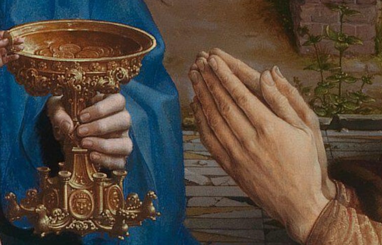 I was about to write something more explicit about *my* favorite interpretation of the coins in the chalice – and one being held out by the Christ-child towards the kneeling man – but perhaps I should wait for you to get to the, um, body of Christ.