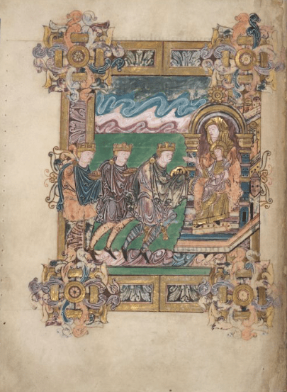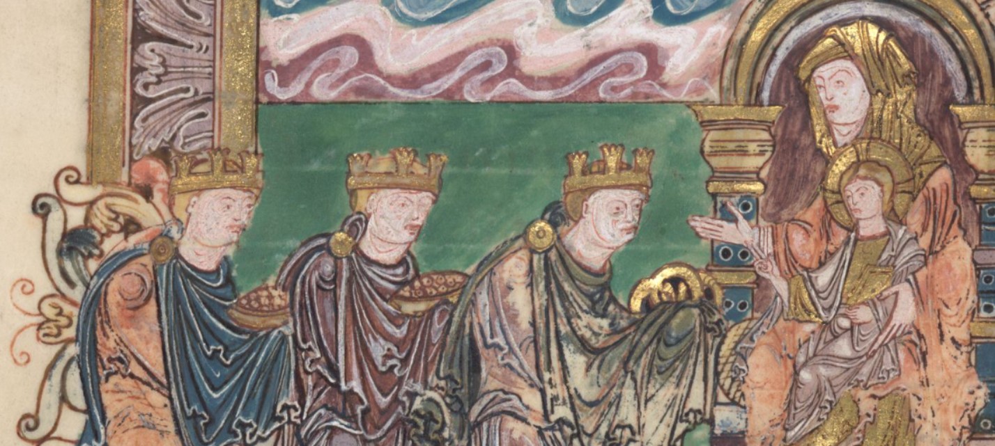 Last week, when I was talking about a 6th Century mosaic showing the procession of the Magi (118 – Epiphany in Ravenna) I said that it was only several centuries later that the Magi began to be seen as Kings (if you want to know why the ‘wise men’ were promoted, why not head back to the Advent Calendar, and specifically day 15?) and that maybe I would come back to that idea fairly soon. So here we are: today’s image is a fantastic example. It comes from the 10th Century, which is when the ‘Kings’ first appear in art, and can be found in a richly illuminated manuscript in the British Museum, The Benedictional of St Æthelwold, which has been fully digitised – so you can flick through the pages yourself in the privacy of your own cell, just as Æthelwold, the man who commissioned it, might have done. He was bishop of Winchester from 963-984, which gives us the dates for the image – a two-decade span, admittedly, but that’s quite narrow given that it was over a millennium ago. The status of these supplicants cannot be doubted: whatever fashions they wear, the crowns tell us that they are kings, although they process much as their predecessors the Magi from Ravenna did, some three centuries before, towards the enthroned Madonna and Child.