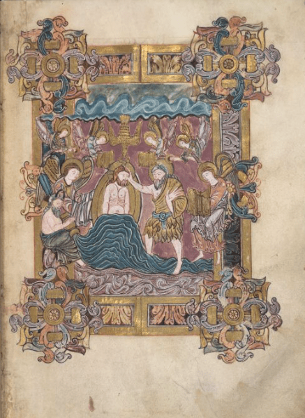 On the opposite page, f. 25r, we see the Baptism of Christ (‘f’ stands for folio, or ‘leaf’ – implying page – which, in a manuscript, is only numbered on one side, the recto, or ‘front’. The other side is called the verso, or ‘back’, hence 24v for the Adoration and 25r for the Baptism). These two images come together because, in the early days of the church, the Adoration of the Magi and the Baptism of Christ were both celebrated on 6 January, two of the three ‘Epiphanies’ remembered on that day – the third being the Wedding at Cana. The Benedictional is effectively a calendar of blessings to be said during church services throughout the ecclesiastical year.