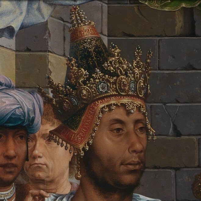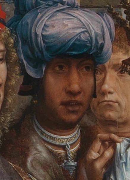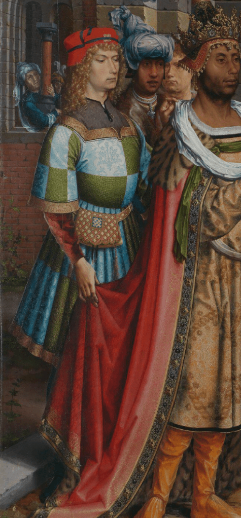 The cap is often used in heraldry, something with which I’m afraid to say I’ve never got to grips. However, it denotes a special respect or status – aristocratic or even royal. The Oxford English Dictionary says that both Henry VII and Henry VIII were granted one by the pope, for example. The origin of the name is obscure, but it could simply relate to the idea that the cap can be used to ‘maintain’ the crown on the head, by making it fit more easily. It would also stop the hard metal from scratching the head of an all-too-sensitive monarch. Like the drawing, Caspar’s ‘crown’ appears to be made of red velvet lined with ermine – but that’s not the crown. That’s just the cap of maintenance. The crown is what appears to be the hat band, which I described as ‘made of elaborate gold links with black tynes’ – i.e. the pointy bits. Seen like this, it is clear that both Balthazar and Melchior are wearing crowns over caps of maintenance, but that Gossaert has adapted the caps to make them look more ‘foreign’ – as those wearing them have travelled from afar. Melchior’s (on the right) is closer to the standard idea, with a peak and a turned up brim.