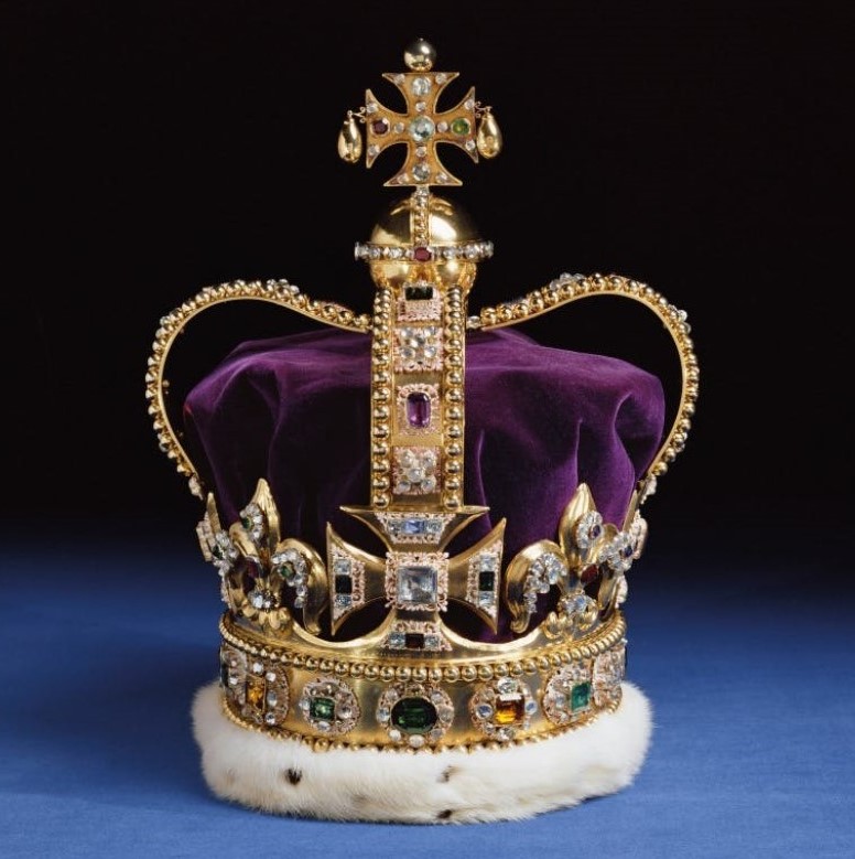 In heraldic terms, the cap would be worn with the trailing peak at the back – but that is not how Melchior wears his (nor, I suspect, would Casper). There is a stylistic resemblance to the medieval bycocket – modelled for us by the Empress Helena, below, in a detail from Agnolo Gaddi’s fresco cycle of the Legend of the True Cross in Santa Croce in Florence (c. 1380). However, if you look carefully, she is also wearing a crown over it, although the crown is only just sketched in, possibly a secco. It may have been Gaddi’s intention to gild it, thus making her look truly regal – but that never happened. It’s also worthwhile having a look at our own Queen’s crown – the Crown of St Edward, made in 1661 for the coronation of Charles II.  The ermine trim at the bottom and the purple velvet inside are adaptations of the cap of maintenance.