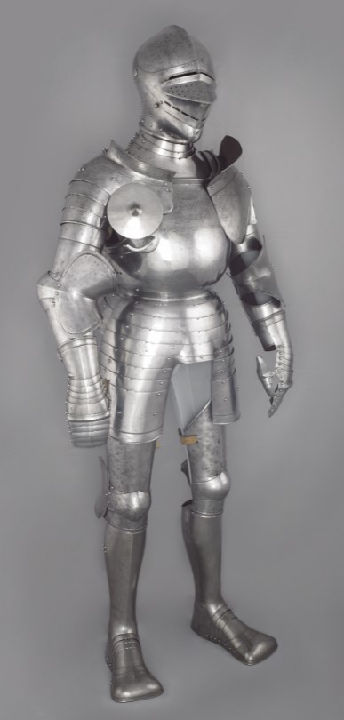Armour was often made to match contemporary fashion, and, given that the armour is made of inflexible steel, the waist is not created by a tightening of the belt. The full, rounded stomach implies there would be a padded doublet underneath – or, at least, it is made in emulation of a padded doublet, which in all three cases is rounded to include the chest: those are not pot bellies! The same is true of other elements of the armour. Have a look at the square toes of the sabatons (the equivalent of shoes): they are the same shape as Jean de Dinteville’s slippers in Holbein’s Ambassadors. They are far more practical than the sabatons of the 14th and 15th century which were absurdly pointy, just like the contemporary shoes. Fun for banquets, perhaps, but hardly practical in battle – unless you got within kicking distance, I suppose, but kicking isn’t easy in full body armour.