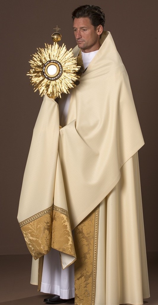 Balthazar is holding his gift with a stole around his neck, and two of you pointed out the similarity between the stole and the humeral veil – thank you! I rarely attend church services these days (or didn’t, in the days when one could), and know relatively little about how the contemporary church functions. But the humeral veil is a form of stole used in the Roman Catholic Church, as well as some Anglican and Lutheran Churches, in order to hold something which should not be touched – such as a ciborium or monstrance – as a sign of respect for the sanctity of the object. I’m comparing Balthazar here with an image from a contemporary website for the purchase of vestments. It’s appropriate, as the priest is shown holding a monstrance, which is used to display the consecrated host – and I ended up comparing both Balthazar and Melchior’s gifts (or at least the ‘containers’ they came in) to monstrances.