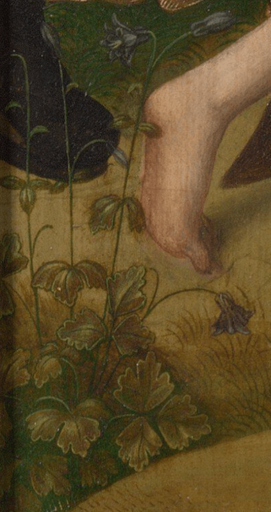 The naturalistic representation of flora and fauna in Western art became more common towards the end of the 14th Century, and is especially favoured in the 15th and early 16th Centuries (and later, of course, in still life painting), which gives us a (very) rough time frame for our painting. However, the leaves are subtly shaded, the tonal values giving us a good idea of their three-dimensional form. This degree of naturalism is seen little before the 1420s, although it does exist, but nevertheless, we should definitely be thinking about the 15th or 16th Centuries. As a reference point, Jan van Eyck’s Ghent Altarpiece, completed in 1432, has a plethora of spectacularly naturalistic plants. Given that the flower is symbolic of the Holy Spirit, then this could well be a religious painting (it is Lent, after all), but despite this, it could be a naturalistic detail in a portrait, or mythological painting, I suppose. Let’s face it, Titian included one in the bottom right-hand corner of Bacchus and Ariadne (1520-23), next to some horsetail (Equisetum arvense) and an iris (Iris graminea) – see below.  As for the other things we see in today’s detail (see above) – well, they don’t do well out of being removed from their context. We’ll come back to them some other time, I presume, and in future posts I’ll just ignore everything that doesn’t seem relevant!