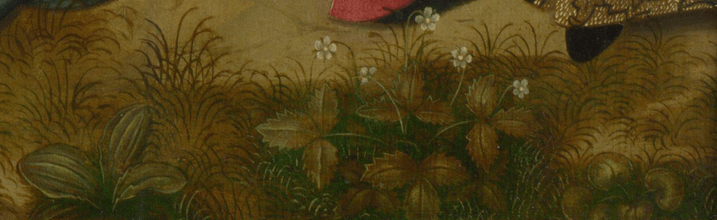 The final plant is a violet, Viola odorata. Even if it isn’t in bloom, the heart-shaped leaves are a giveaway. And guess what? Violets also have a religious symbolism. The flowers appear to look down, as if they do not want to appear too bold: they are a symbol of humility, and specifically, the humility of the Virgin Mary. Not only did St Bernard of Clairvaux (1090-1153) describe Mary as ‘the violet of humility’, but the colour of the flower is not dissimilar to the deep blue of the ultramarine in which she is so often dressed. You can see this colouristic echo in the detail below from The Wilton Diptych in which the verdant greenery and scattered flowers (accurately depicted, although not to scale) represent the heavenly paradise.
