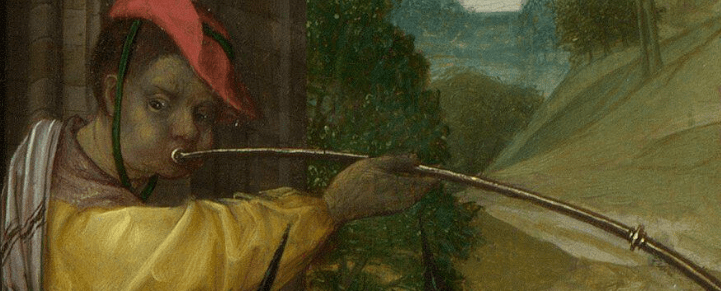 What most intrigues me about today’s detail is the fact that the artist has painted a black trumpeter. Given that there are so few people of colour represented in paintings in the National Gallery (so now you know where it is!) I am amazed that I only became aware of this man’s existence when I began looking at this work in preparation for this Lenten series. But then, that is the value of looking at anything without preconceptions. If you think you know what is there, as I thought I did, you only see what you expect. By taking the details out of context, as we are, you get more of a chance to see everything that is needed to make a painting work. As my PhD supervisor once advised me (it may have been the only advice I got), keep looking until you’ve seen everything, and can’t possibly see any more. And then look again.