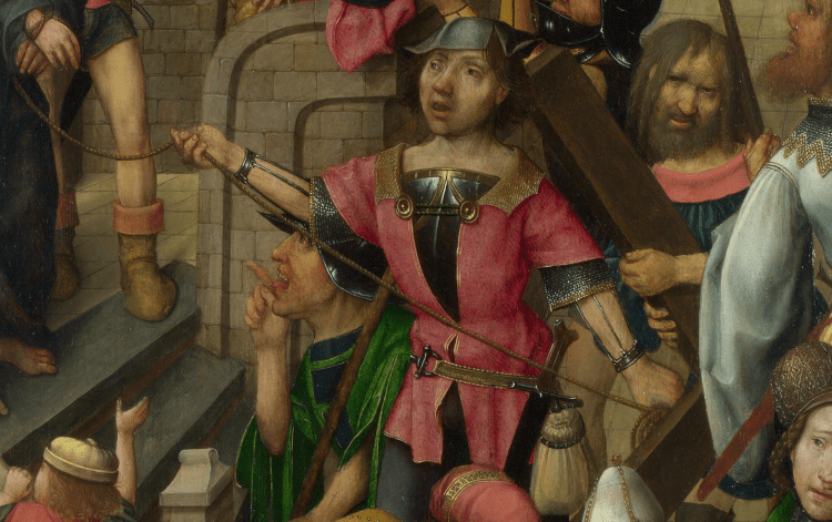 Another detail I love here: the guards are clearly well rewarded. I’ve already commented on their elaborate clothing, but look at the purse of the man holding the rope. We see another pentimento, and in this case it tells us that the purse was originally smaller. It seems that, after taking on this job, he needed a bigger one, which was painted over the first. The rope shows us, subtly, the direction of travel – down to the right – and then the cross takes over: in a couple of days we will head off from the top right of this detail – the cross points the way. The man holding it up has the typical grimace, and ugly distortions of form, seen throughout this rabble. It is not the ugliness of everyday life, as someone understandably asked me yesterday, but an expression of the inner character of these people. The idea – now rejected, thank goodness – was that the exterior appearance reflected the interior qualities. We see it again with the man at the very top right. He wears the finest clothes – the decorative chain mail around his collar appears like sewn pearls, and the silvery sleeve is tailored to an elegant fullness – and yet he has a ridiculous snub nose: the perceived ‘ugliness’ of his facial features would reflect the supposed ugliness of his mindset. He does, however, know which way we are going, and in a couple of days we shall follow his lead.