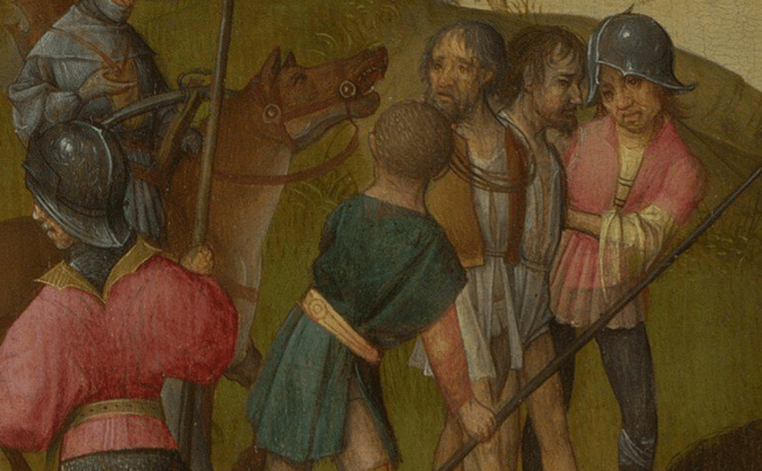 Two men in their shirts and pants, with one, possibly both, also wearing a waistcoat. Their legs are bare. A rope goes around the older man’s shoulders, and they are led by two guards – one with a helmet, another with a spear. We cannot see the arms of the two prisoners – maybe their hands are tied behind their backs. One has grey hair and a grey beard, another brown hair and a short, straggly beard. We are back with the two thieves, being led to their deaths, and yet, they do not look the same. At some point, between approaching the city gate and arriving at the green hill without the city wall someone has thought to find them something more to wear. Maybe it was decided, before they even left town, that it wouldn’t do to have thieves wandering around in just their pants. Humiliation is one thing, but a shred of decency for the sake of the onlookers might not go amiss. Not only that, though – there has been time for the older thief’s hair to grow, and, conversely, for the younger one to get a haircut, darken his hair, and grow a beard, however straggly. Check back to Lent 19 if you want to be sure. They have also swapped sides, and changed guards, but neither of those things are problematic.