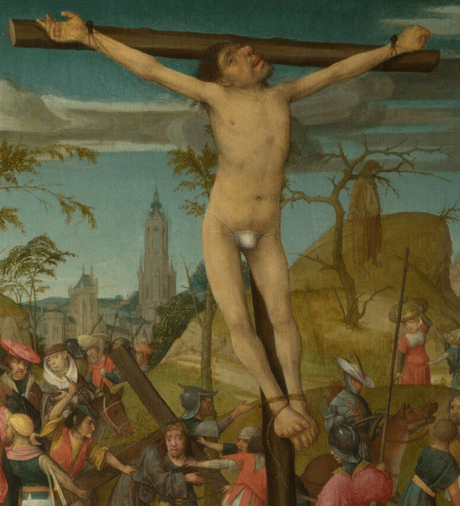 In the same way that I did yesterday, I’m going to ask, ‘How do I know’ that this is the Good Thief? Well, he is at Christ’s right hand (so, the side of the Blessed), and above the Good (the Virgin, John, and the Holy Women are just below him, although I have left no evidence of that in the detail I have picked out for today). He is also associated with Christ and with the Church: in the background we can see Jesus on the Via Crucis and the New Church in Delft. Although Dismas is contorted – a sign of his guilt, and of his repentance, perhaps – his back arches and his head tilts upwards – and so he faces heaven. He also has good weather… However, we can also see the post-suicidal Judas to the right. Maybe this implies that by taking his own life we know that Judas was repentant, and this, at least, could be considered ‘good’? I don’t know. As Hamlet says ‘the Everlasting… fix’d his cannon ’gainst self-slaughter,’ and surely two wrongs don’t make a right. But Judas must be there for a reason, and it is something along these lines. Maybe, at least, it is that ‘Justice’ is being done.