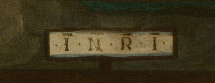 So this is ‘a title’, or in Latin, titulus – which is the word for any label, caption, or inscription, especially those naming figures or subjects in art. To clarify, then, this is the titulus crucis. It tells you who is on the cross – Jesus of Nazareth the King of the Jews, or, in Latin Iesus Nazarenus Rex Iudaeorum, abbreviated here to I.N.R.I. – the dashes above each letter tell you that they are abbreviations.